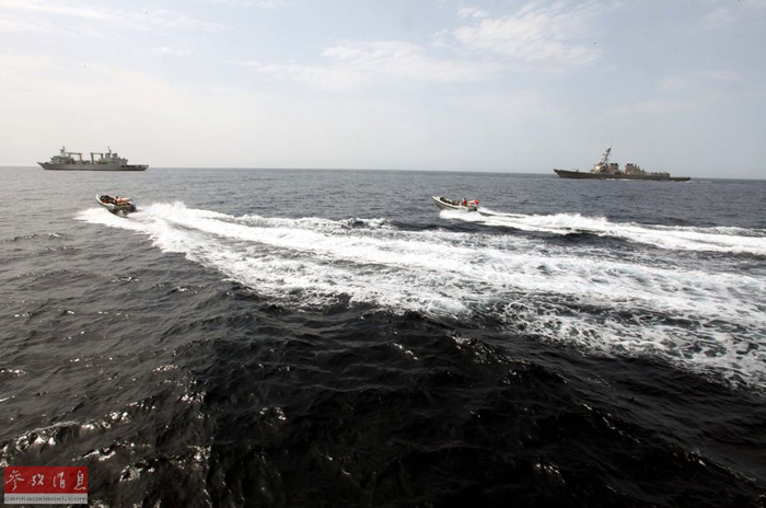 当地时间8月24日至25日,中国海军第十四批护航编队与同在亚丁湾海域执行任务的美国海军梅森号导弹驱逐舰举行中美海上联合反海盗演练。图为中美双方特战队员驾驶小艇对充当被劫持商船的微山湖补给舰实行“武力营救”。新华社记者饶饶摄