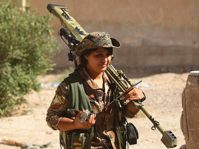 6月21日,拉卡东部,一名库尔德“人民保护部队”女兵扛着重型狙击枪。(新华/法新)五角大楼没有明说向“人民保护部队”提供过哪些武器。多名不愿公开姓名的美方官员告诉美联社记者,武器可能包括120毫米口径的迫击炮、机枪、弹药和轻装甲车,火炮和地对空导弹不在援助清单内。