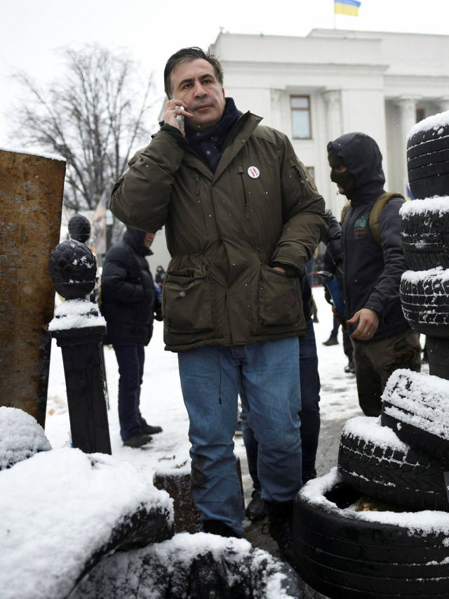 12月6日,乌克兰首都基辅议会大厦外,萨卡什维利站在轮胎路障旁打着电话。(新华/路透)2014年乌克兰政局骤变,萨卡什维利支持针对乌克兰时任总统维克托·亚努科维奇的抗议。乌克兰新政府成立后,萨卡什维利于2015年2月由波罗申科任命为国际改革协商委员会主席。同年5月,他获得乌克兰国籍,被波罗申科任命为敖德萨州州长,前往这一腐败“重灾区”反腐。