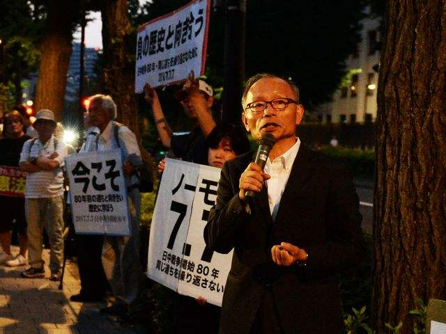 7月7日,日本山口大学名誉教授纐缬厚(右)在东京举行的纪念“七七事变”80周年集会上讲述日军侵华暴行。(新华社记者马平摄)援引“历史是过去的政治,政治是现在的历史”一说,山口大学名誉教授、历史学者纐缬厚指出,对现代人而言,必须从“过去的政治”吸取经验教训,才能获得开创和平未来的智慧和勇气。“那些不愿正视历史真相的国家和个人必将承受现实带来的不安和惶恐。”