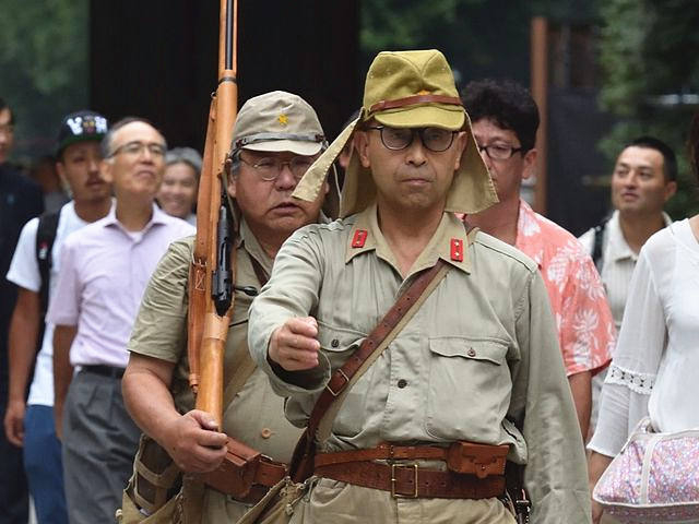 8月15日,两名老年男子,身着旧日本帝国陆军军服,走在东京靖国神社内。(新华/法新)新华社东京12月13日电(记者杨汀 王可佳 邓敏)森正孝,在日本国立静冈大学讲授和平学,对当前战争体验“风化”现象有一种紧迫感。