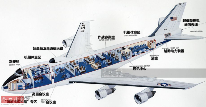 E-4系列由波音747-200B宽体客机改装而来,共制造了4架:3架E-4A和1架E-4B(搭载有更先进的通信设备),首架E-4A于1973年首飞,1974年12月投入服役,到1985年1月时,4架全部升级至E-4B的标准。E-4B共有3层舱室,上层为驾驶舱和乘员休息室。中层可搭载乘员94人。从前向后有最高指挥当局办公室、会议室、参谋人员工作区、通讯中心和技术控制中心等。图为E-4B剖面结构图。