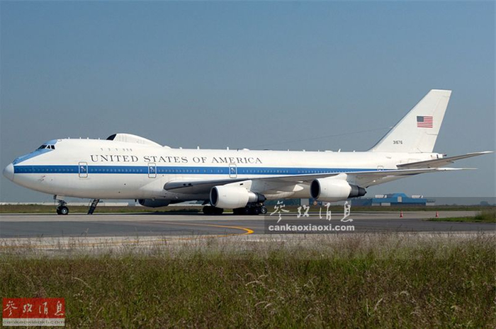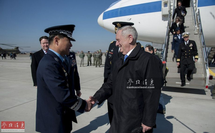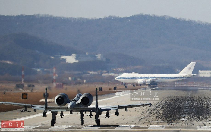 图为马蒂斯搭乘的E-4B飞抵韩国乌山空军基地时,跑道上还有一架A-10攻击机在警戒。