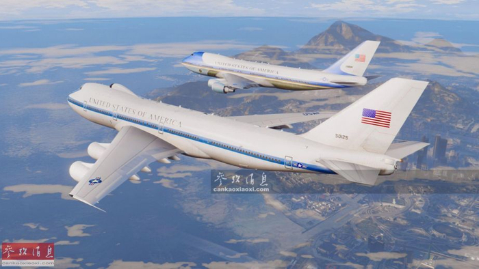 图为游戏中,玩家制作的E-4B指挥机(近)与“空军一号”(远)专机建模进行编队飞行。
