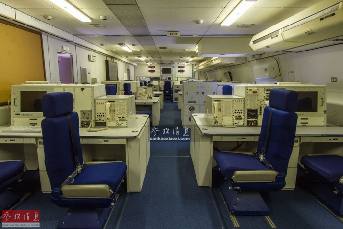 作为备用核反击指挥部,E-4B搭载有13套专用通信设备及46组天线,其中包括位于机背整流罩内的超高频卫星通信天线(可与部署在全球各地的美军指挥部进行通信)以及布置在机尾的可用绞盘收放的全长达8千米的超低频拖曳天线(用于同水下的战略核潜艇进行通信)。E-4B最多可搭载114名乘员。图为作战参谋室资料图,可见其搭载的电子设备均经过抗EMP攻击设计。