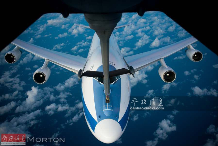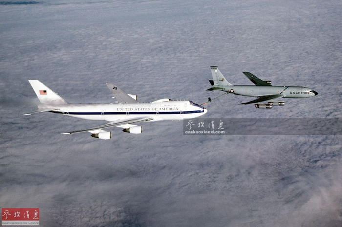 E-4B以波音747为平台改装而来,保留了747的滞空时间长以及跨洲际飞行能力,E-4B最大巡航速度0.8马赫,不进行空中加油时的最大航程为1.1万千米,最大滞空时间超过150小时,在经过空中加油后,其航程和滞空时间仍可扩展。图为E-4B正在进行空中加油。