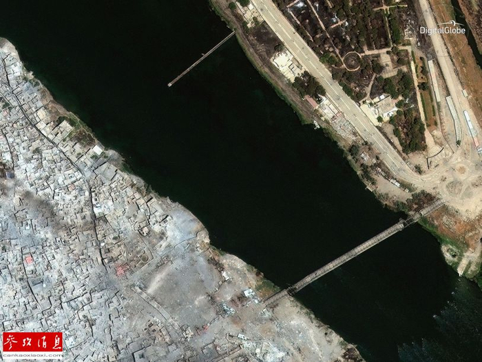 图为2017年7月航拍到的摩苏尔市第五大桥及附近城区的景象图。从图中可见,在前一幅图片中原本不起眼的绿地,已经成为这片布满瓦砾的景象中唯一的亮色。