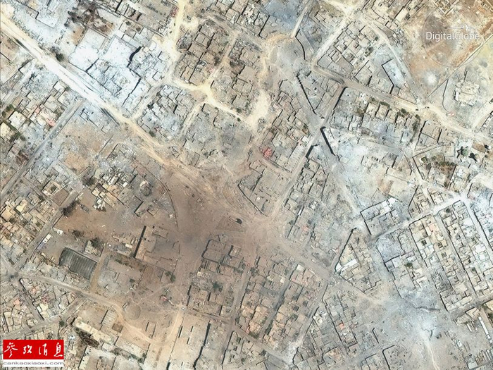图为2017年7月航拍到的大阿尔努清真寺及附近城区的景象。除却清真寺的圆顶和附近零星的残破建筑,这一地区的建筑群已经不复存在。