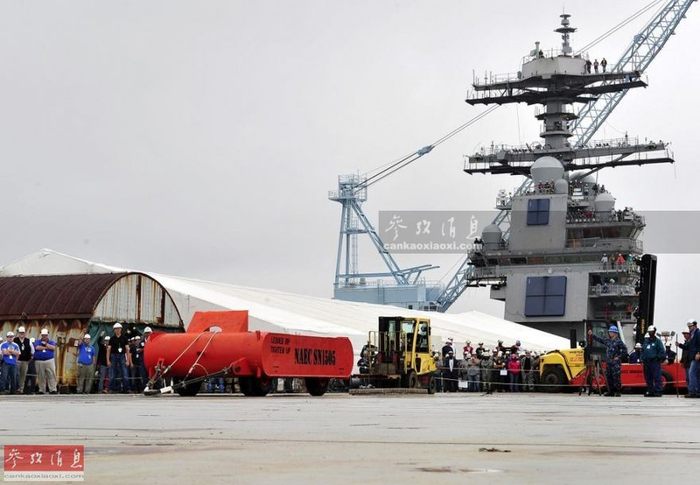 图为福特号海军舰员将道具车与EMALS弹射器相连接,可见车的尺寸并不小。