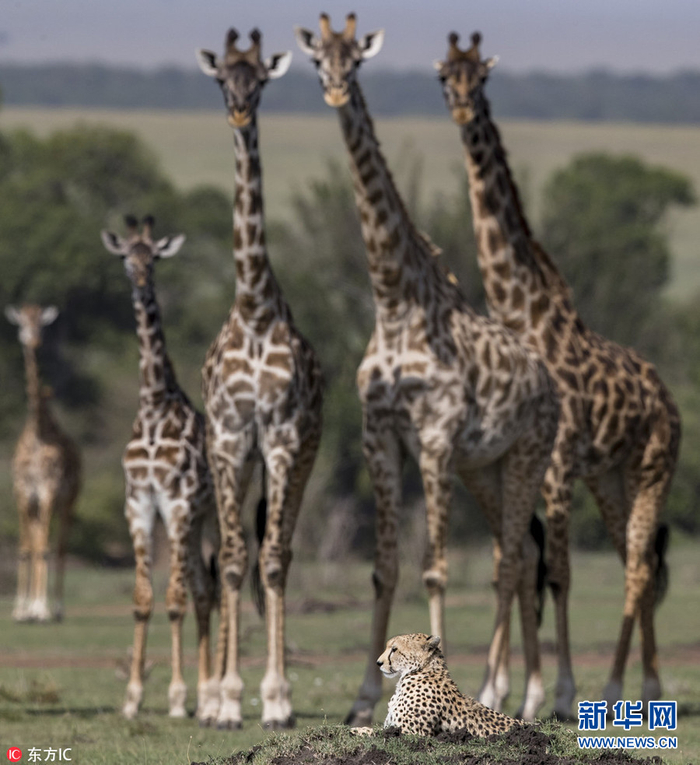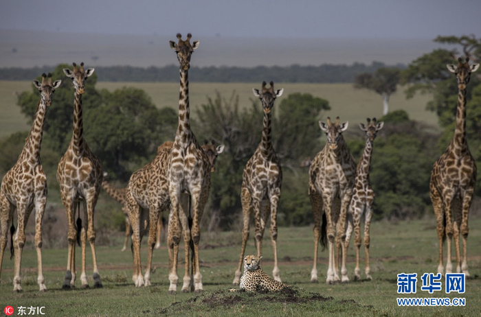 1月13日,肯尼亚马赛马拉国家动物保护区,野生动物摄影师Paul Goldstein在当地拍摄到一组罕见的照片,画面中一头雌性猎豹正躺在草原上休息,而它的周边是一群长颈鹿。这头猎豹似乎正在安安静静地过它的周末,淡定地趴在平原上,连一点狩猎欲望都没有。它的举动吸引了一群长颈鹿前来围观,它们慢慢靠近猎豹,似要研究下它在干什么。不过,这群神经紧张的长颈鹿最终还是走开了。(图片来源:东方IC)