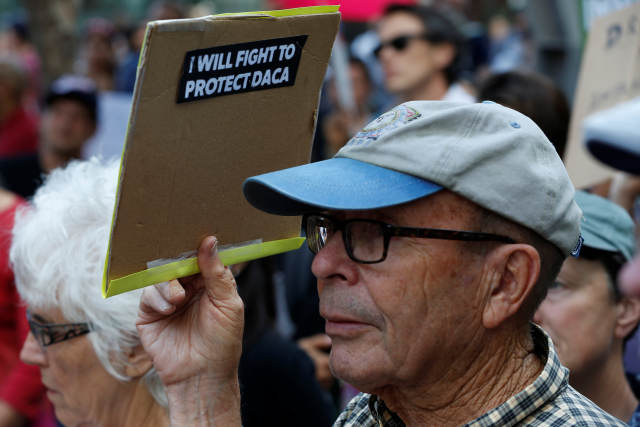 2017年9月5日,在美国旧金山,一名男子手持标语牌,抗议总统特朗普废除“童年抵美者暂缓遣返”计划。(新华社/路透)芝加哥居民吉米·弗里茨勒森直言,特朗普给她的印象只有坏:“偏执、种族主义、反同性恋、反移民。我希望民主党在2018年中期选举能大胜,这样特朗普的很多主张可以被国会缓和掉。”