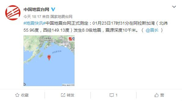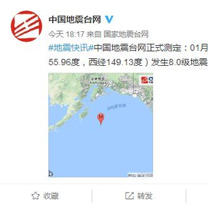 [环球网综合报道]经中国地震台网正式测定,1月23日17时31分在阿拉斯加湾(北纬55.96度,西经149.13度)发生8.0级地震,震源深度10千米。