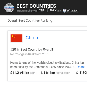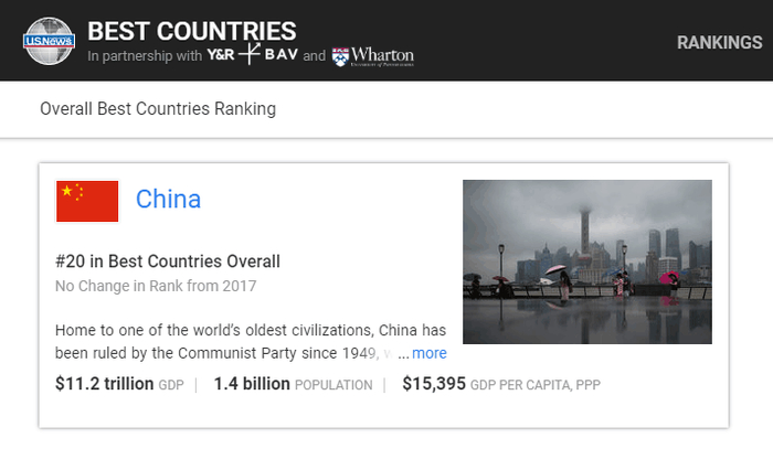 [环球网报道 记者 余鹏飞]美国新闻与世界报告、Y&R‘s BAV集团、宾州大学沃顿商学院于近日发布了2018年度最佳国家报告(Best Countries report)。其中,中国综合评估位居第20名;在“世界最强大国家”排名中,中国位列第三。