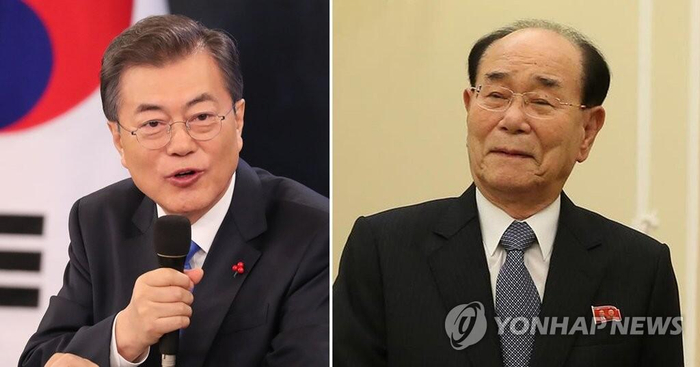 图注:韩国总统文在寅(左) 朝鲜最高人民会议常任委员会委员长金永南(右)
