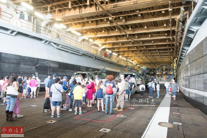 从舰艉坞舱门角度拍摄的“巴丹”号坞舱,进一步凸显空间的巨大,具有很强的搭载能力。