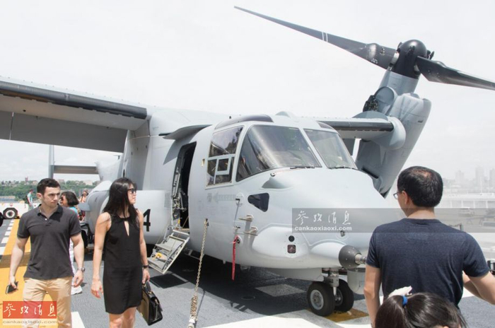 飞行甲板上还停有一架MV-22“鱼鹰”倾转旋翼机。