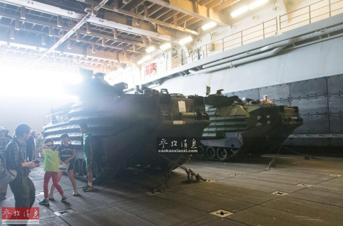 图为并排停放在坞舱内的2辆AAV7A1两栖突击车,这种突击车也是陆战队的主战装备之一。