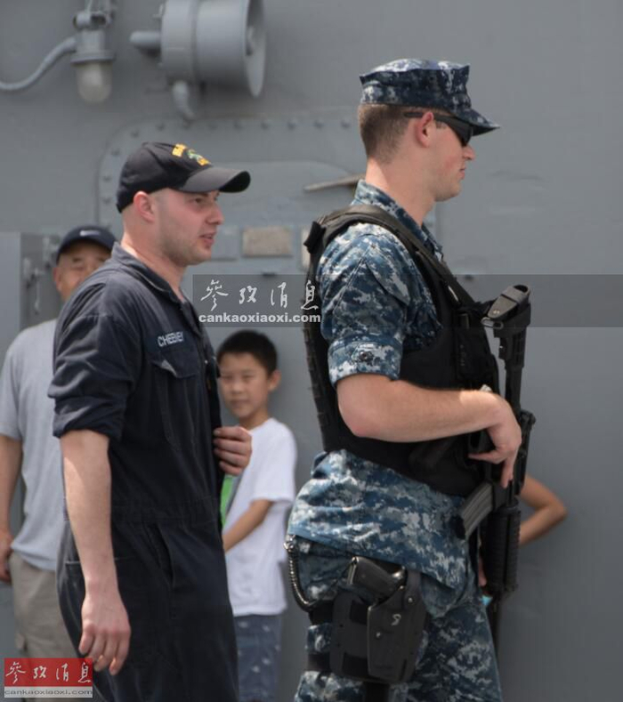图为在飞行甲板上执勤的海军士兵,除M4卡宾枪、防弹背心外,还有一把手枪作为副武器。