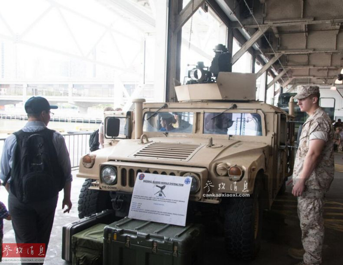 到达车辆甲板后,可见一辆搭载有陶式反坦克导弹发射器的悍马车,发射器周围还有防盾。
