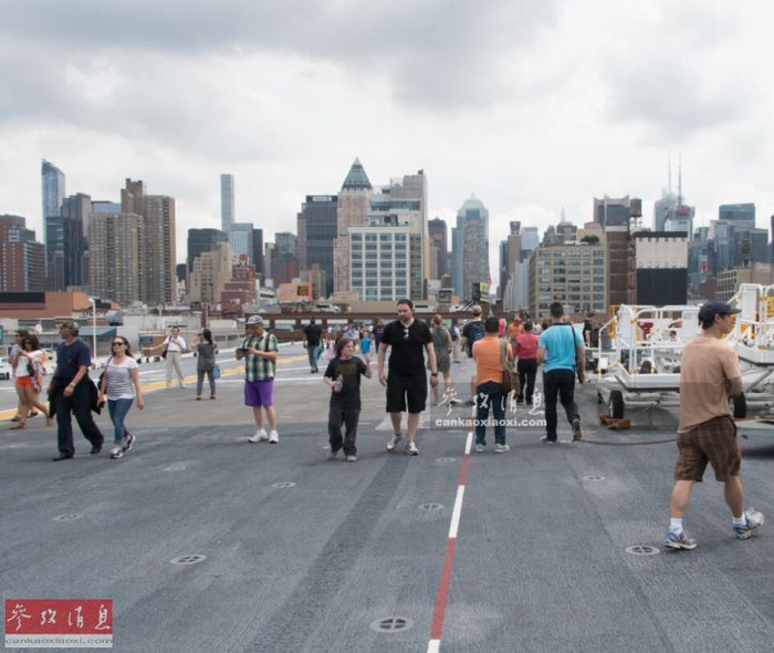 朝“巴丹”号舰艏方向拍摄的飞行甲板,除密集的人群外,还能看到曼哈顿岛密集的楼群。