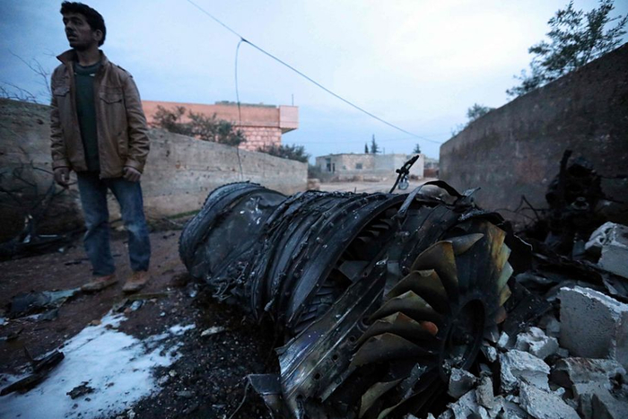 2月3日,在叙利亚西北部伊德利卜省,一名男子站在被击落的俄军苏-25战机残骸旁边。俄罗斯一架苏-25战机3日在叙利亚西北部伊德利卜省执行打击极端分子任务时被便携式防空导弹击落,该战机飞行员成功弹射跳伞,并向俄军方报告跳伞位置在极端组织“征服阵线”控制区上空。随后,该飞行员在与极端分子交火中丧生。新华社/法新