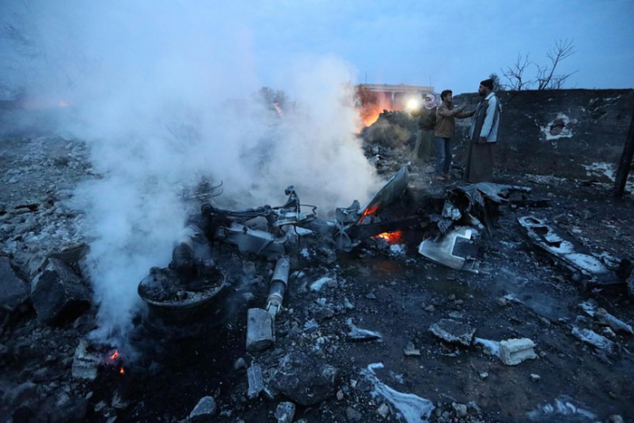 这是2月3日在叙利亚西北部伊德利卜省拍摄的被击落的俄军苏-25战机残骸。俄罗斯一架苏-25战机3日在叙利亚西北部伊德利卜省执行打击极端分子任务时被便携式防空导弹击落,该战机飞行员成功弹射跳伞,并向俄军方报告跳伞位置在极端组织“征服阵线”控制区上空。随后,该飞行员在与极端分子交火中丧生。新华社/法新