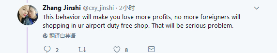 网友Zhang Jinshi:这样的行为会让你失去更多效益,外国人(非英国人)可能不会再去你们的免税店。这就很严重了。