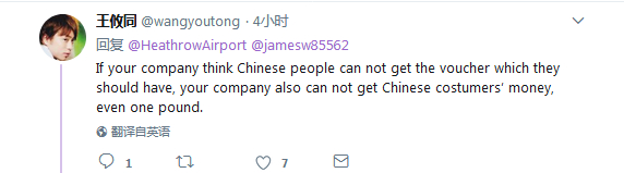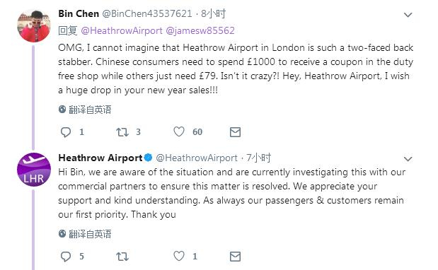 网友@Bin Chen:我的天哪!真难以想象希斯罗机场是这样背后捅刀子的双面人。中国人要花1000英镑才能在免税店拿到一张优惠券,其他人就只需要79英镑?疯了吧?!嘿,希斯罗机场,祝您新年业绩大跌!