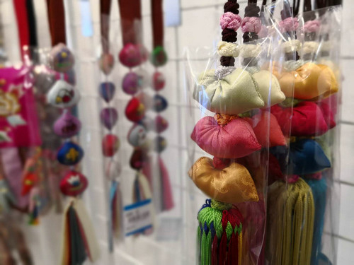 在平昌冬奥会媒体中心旁一家商店的韩国传统工艺品柜台里,悬挂着精致的香囊、香袋和其他有民族特色的工艺品。(刘华 摄)