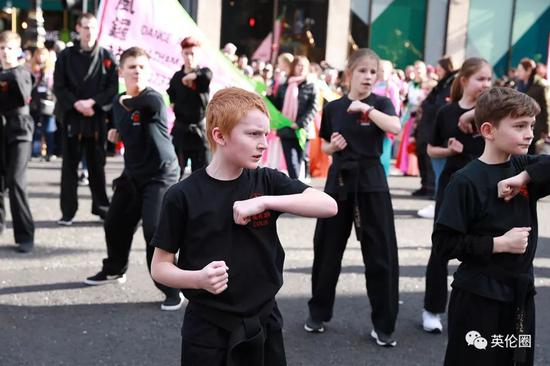 而英国人对中国文化的理解和欣赏范围,也早就超出了舞龙舞狮这些符号化的表象,前文里提到的队伍里能看到各种代表性文化元素,从汉服到武术,从扇子舞到中文私塾……