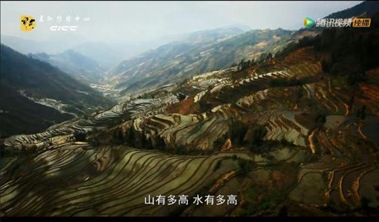 水稻梯田上,农民悠然耕作;雪国大地上,高铁飞驰;西北大漠上,巨型“风车”轻缓的画着弧线。俯瞰之外的工笔描绘也堪称惊艳。
