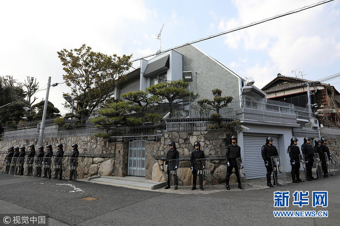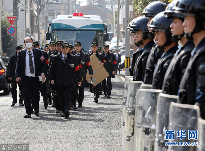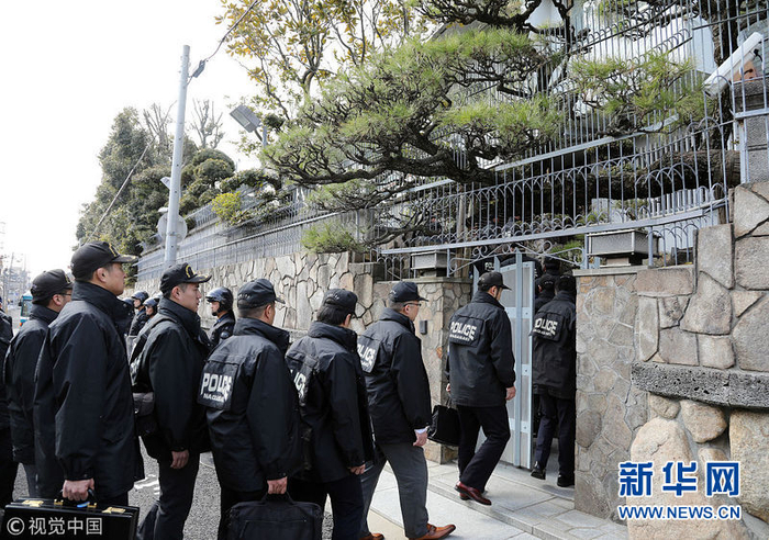 2月26日,日本兵库县神户市,大批警察对当地“山口组”总部进行搜查。“山口组”是日本最大的黑帮,也是世界上最大的犯罪组织之一。因在2016年涉嫌参与伪造银行卡在日本多地ATM机上盗取现金,总金额高达18亿日元(约合人民币1.06亿元),当地警方对其所在地进行搜查。(图片来源:视觉中国)