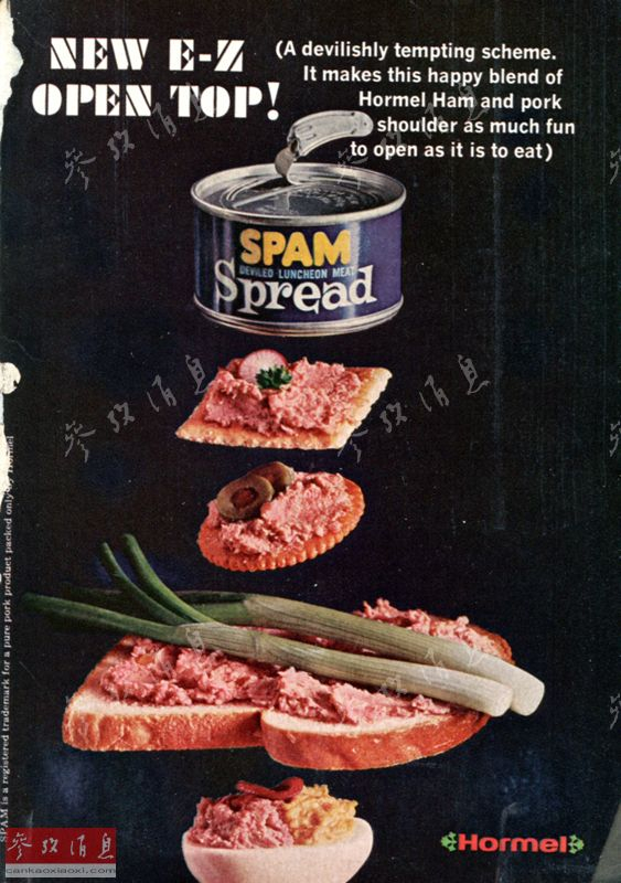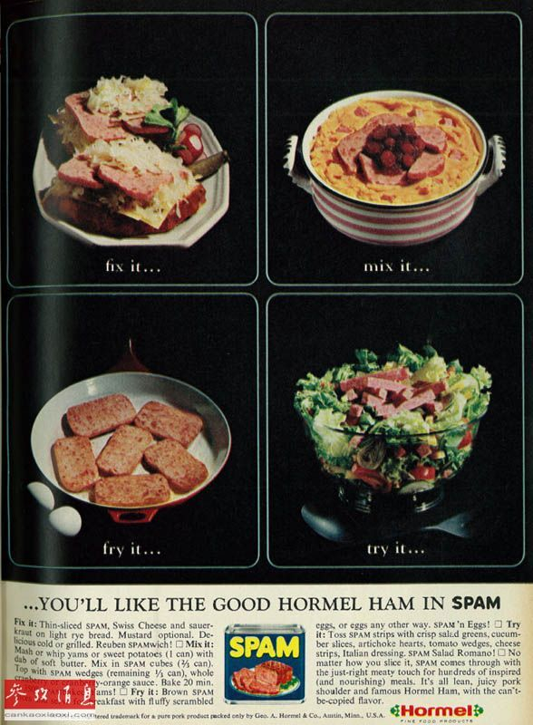 到1970年之前,斯帕姆午餐肉都可谓国际时尚的代表。它曾出现在世界各地的菜谱中。英国的一部讽刺幽默作品则令它名垂史册。那一年,荷美尔公司售出了第20亿罐斯帕姆午餐肉。图为1966年的斯帕姆宣传图片。