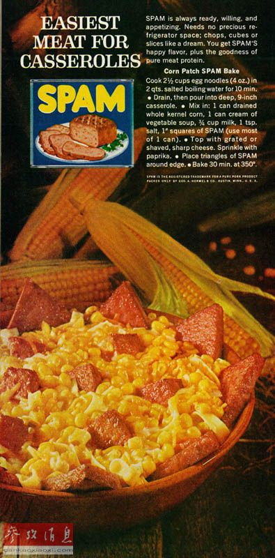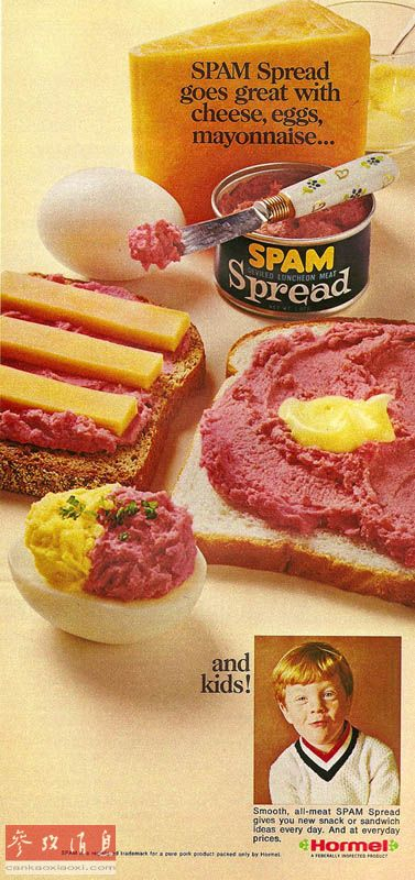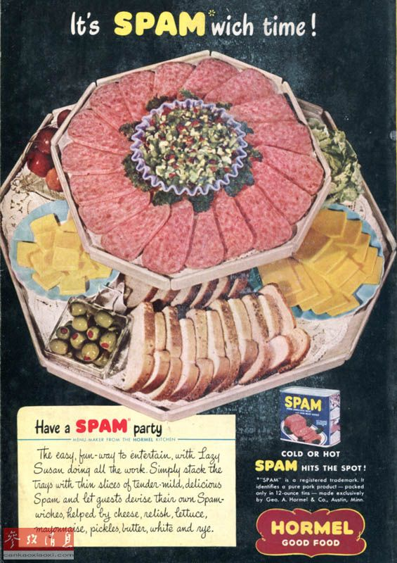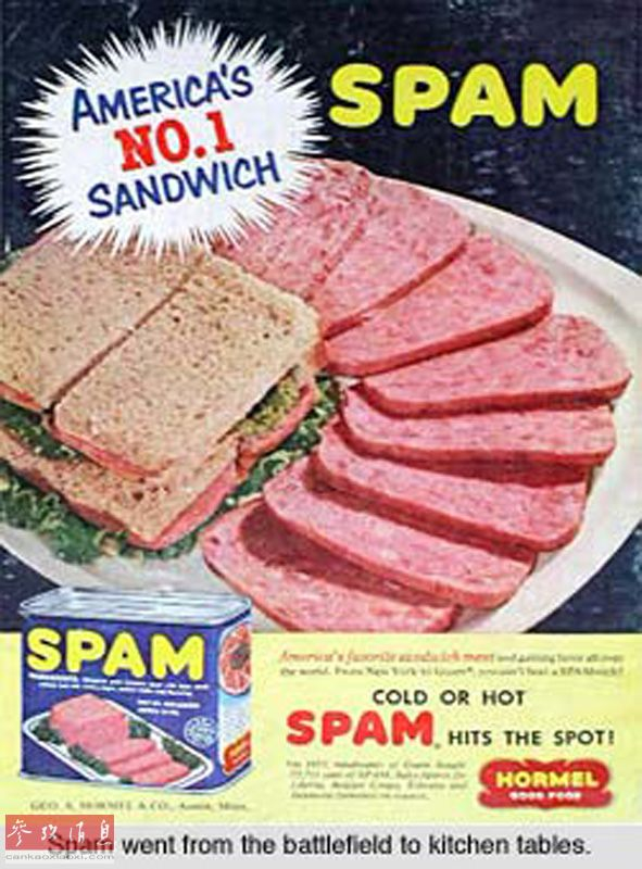 斯帕姆午餐肉这个意指由猪肉、盐、水、土豆淀粉、糖和亚硝酸钠组成的混合物的引人注目的名称1937年经注册成为一个商标。图为1940年的斯帕姆广告。