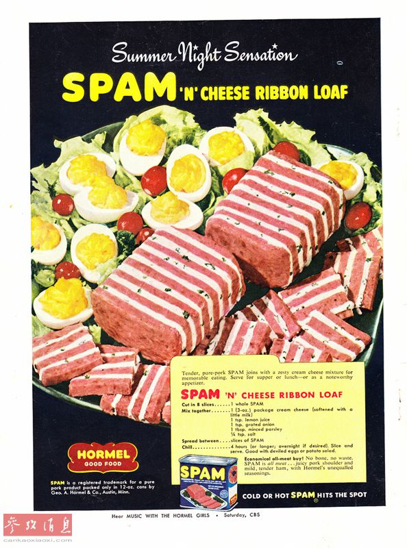 截至1940年,它已经被端上了美国70%城市家庭的餐桌。图为二战时期的斯帕姆午餐肉广告。