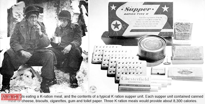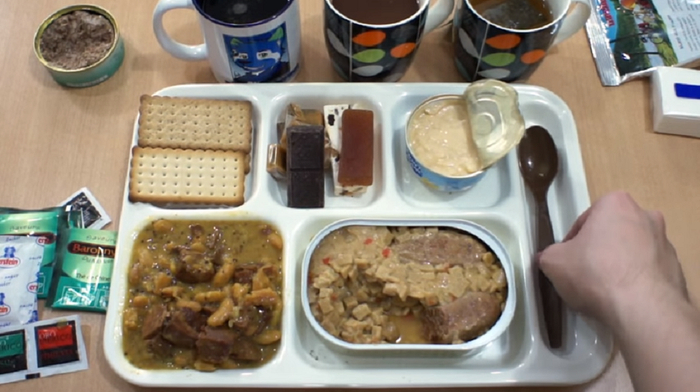 法国:这当然不是大厨做的菜品,您在这里找不到高脚杯的葡萄酒,但这些套餐完全可以止饿。两种主要菜品都是半成品,肉配色拉、鱼肉配土豆、鸡肉配蔬菜和米饭,还有冷盘,通常来说是鱼罐头。另外还有速溶汤包、饼干、一份巧克力、水果糖、奶酪酱、加糖的可可、成包的茶叶、干燥的牛奶浸麦片。这里也可以找到火柴、净水药片、干燥燃料片,以及无明火加热器。