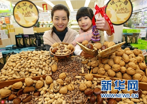 韩国的正月十五叫做“正月大望日”,意为“望满月”。与中国人不同,韩国人在这天不是吃元宵,而是吃由糯米、高粱米、红小豆、黄米、黑豆等杂粮做成的五谷饭,吃各式各样的坚果——花生、核桃、松仁、栗子、银杏等。据说这样可以使牙齿更坚固,还能防止疔疮等皮肤病。