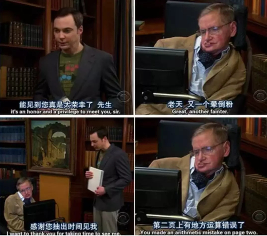 他以客座教授的名义来到谢尔顿所在的大学授课几周,指出了谢尔顿辛辛苦苦做出的研究中的错误。看着倒地的谢尔顿,霍金还淡定吐槽:“又一个晕倒粉”,这还成为了剧中的经典片段之一。