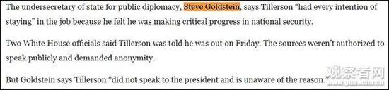 但是高德斯坦却称,蒂勒森“并未与总统有过交流,也不知道解职的原因。”