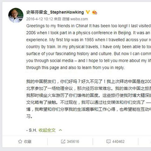 每次来华,他都会在中国掀起一股“霍金热”。2016年4月12日,霍金在中国开通微博,两天内他的微博粉丝已突破三百万。