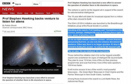 他的意思并非是“霍金称外星人一直在监视地球”。