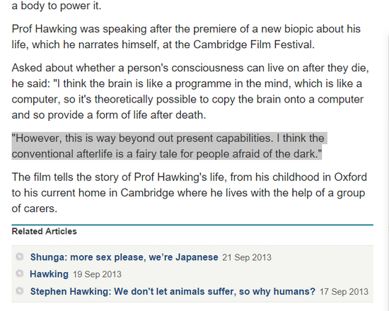 [真相]霍金2013年接受英国《每日电讯报》的采访时,提及了自己对生命的看法。“人的大脑和一台电脑的工作原理本质上差不多。所以单纯从理论上来说:有一天,人的意识是可能脱离肉体,保存到一种设备里的,这样就会形成一种新型的死后生命形态。”但霍金没认为人类技发展到2045年,就能实现意识的复制和保存了。相反,他认为“实现这个目标所需的技术远超我们现在的掌控”。现在就断言2045年能实现意识的复制和保存,霍金本人形容这是一个“童话故事”。