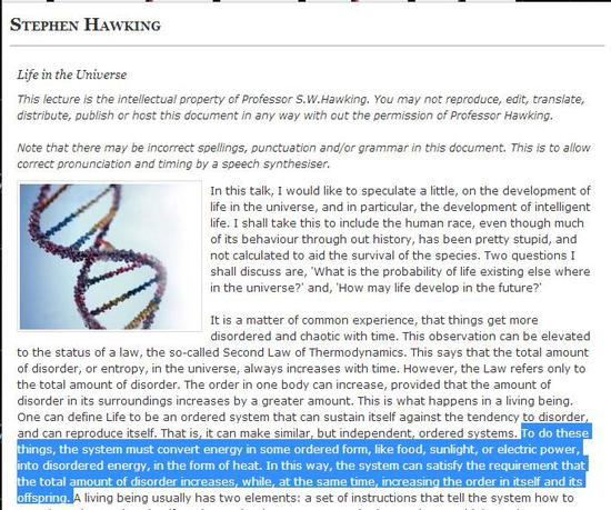 纯“能量体”这种科幻小说内的情节并不符合霍金对生命的看法,在霍金官网内有一篇写于1996年题为《Life in the Universe》的文章,在这篇文章中霍金明确提出了他对生命的理解:“必须有一种从外界汲取能量并转为自己可用能量的机制”。