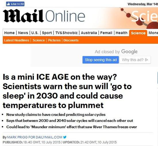 [真相]该谣言起源于英国《每日邮报》题为“科学家们警告太阳将在2030年进入冬眠”的文章,该文章报道了某研究团队通过对太阳活动的分析建立了数学模型,推导出一个可能性“太阳将在2030年进入冬眠”。