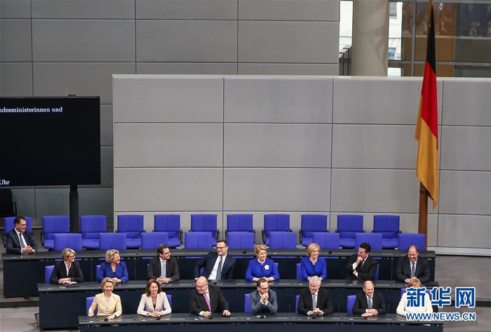 3月14日,在德国首都柏林,德国新一届联邦政府成员出席宣誓仪式。当日,德国新一届联邦政府成员在联邦议院全体会议上宣誓就职。新华社记者单宇琦摄