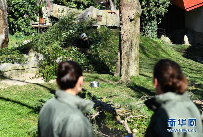 瑞贝卡和艾斯特法妮雅是西班牙马德里动物园的两名女饲养员,她们的主要任务是照顾马德里动物园的“镇园之宝”——三只大熊猫。瑞贝卡和艾斯特法妮雅有多年照顾熊猫的经验,因为两个姑娘年龄、相貌都有几分相似,有人笑称她们是马德里动物园的“熊猫姐妹”。一雄一雌两只大熊猫“冰星”和“花嘴巴”于2007年由成都抵达马德里动物园。它们一共在马德里产下4只幼崽,其中3只已送回中国,2017年出生的“竹莉娜”目前和爸爸妈妈一起生活在马德里动物园。新华社记者郭求达摄