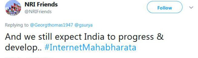 “印度自古以来就使用互联网。在《摩诃婆罗多》中,桑杰是盲人,但他却把战场上发生的事告诉了别人。这是由于互联网技术。卫星也在这段时间内存在。”