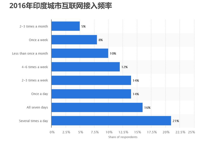 根据印度“互联网实时状态”网站的统计,2016 年印度网络覆盖率为 34.8%。但主要集中在城镇,印度广大农村地区还处于网络盲区。
