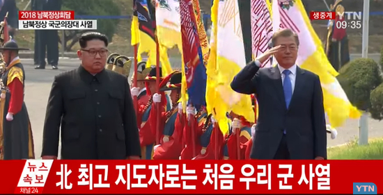 韩国《中央日报》说,韩朝最高领导人交叉检阅对方的军队仪仗队,对韩朝关系而言有巨大的象征意义。
