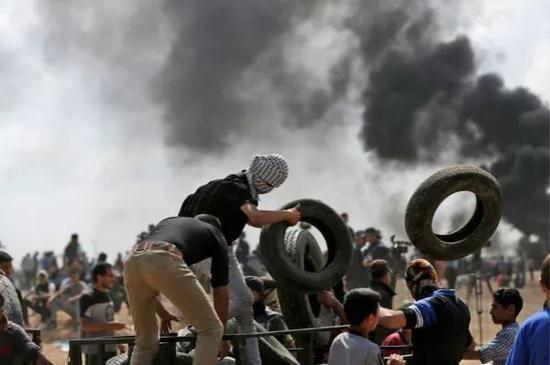 5月11日,在加沙地带东部与以色列接壤的边境地区,一名双腿残疾的巴勒斯坦示威者向以色列士兵投掷石块。